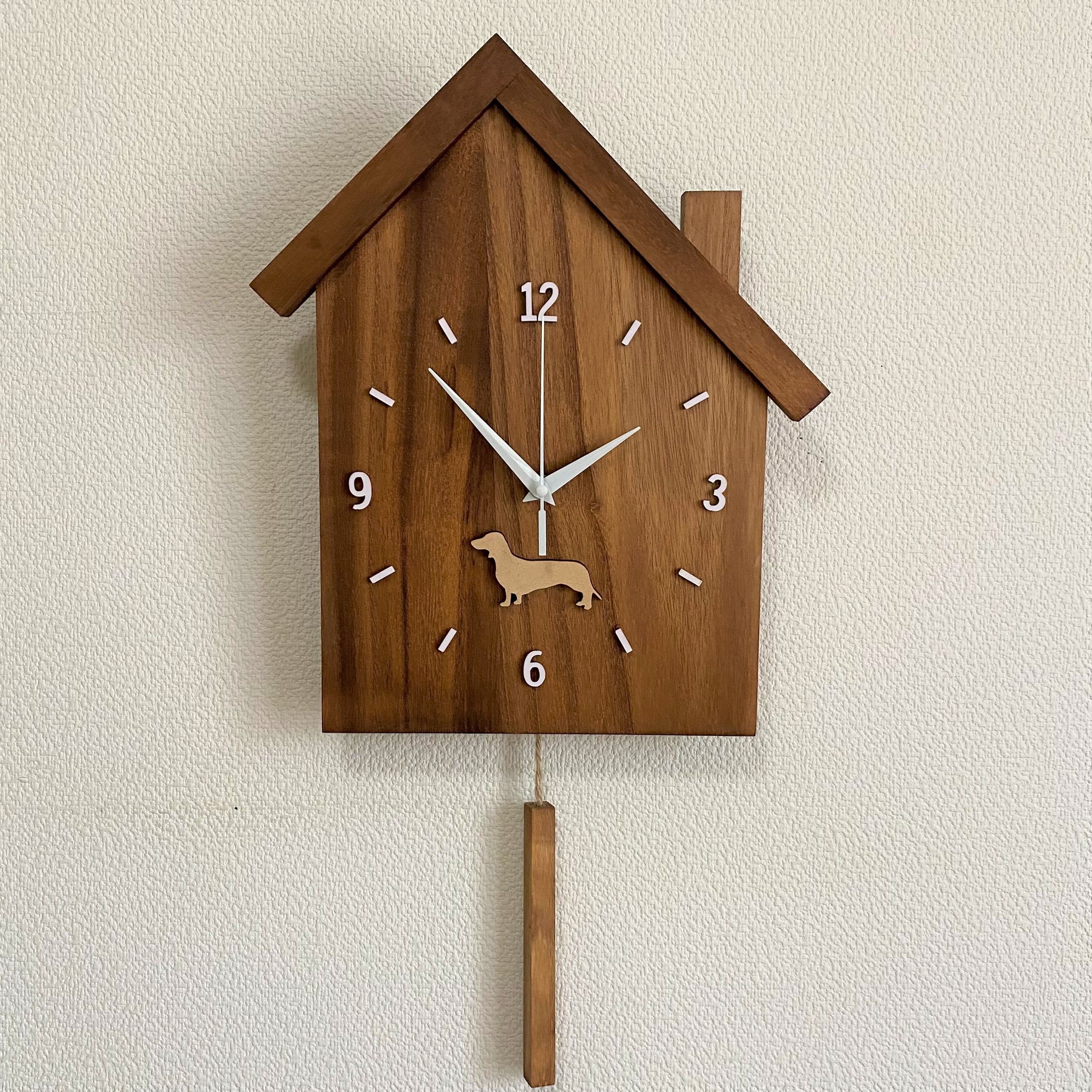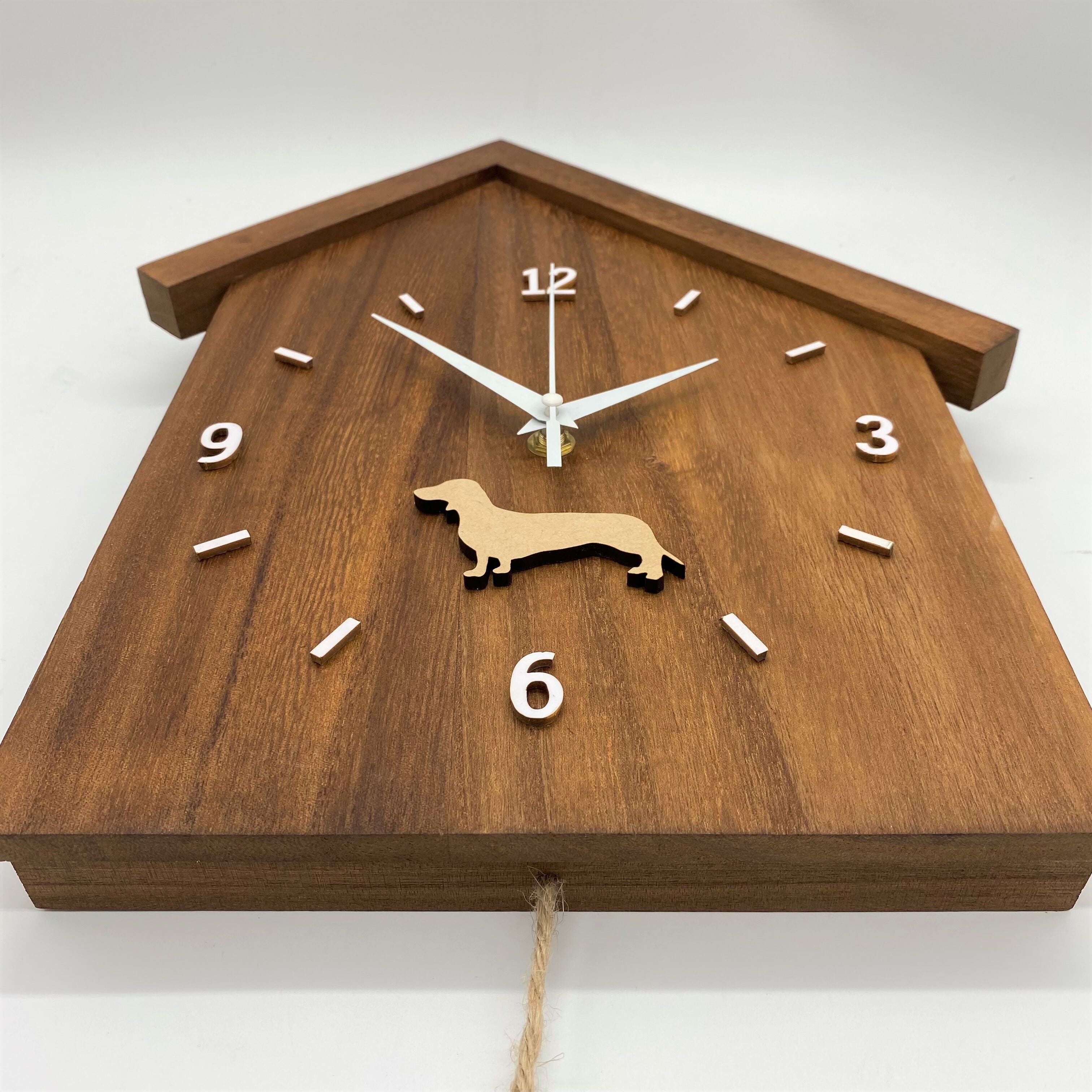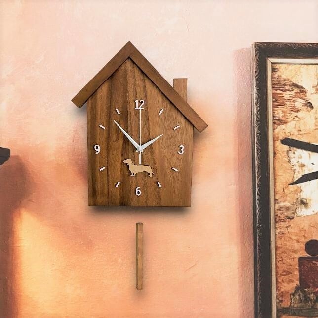 お好きな犬をカスタマイズできるログハウスをモチーフにした木製掛け時計です。ウッド基調の御部屋に最適な商品です。ワンポイントで人気のダックスフンドやトイプードルをはじめとした10種類のワンちゃんを選びカスタマイズする事が出来ます。犬好きにはたまらない時計です。