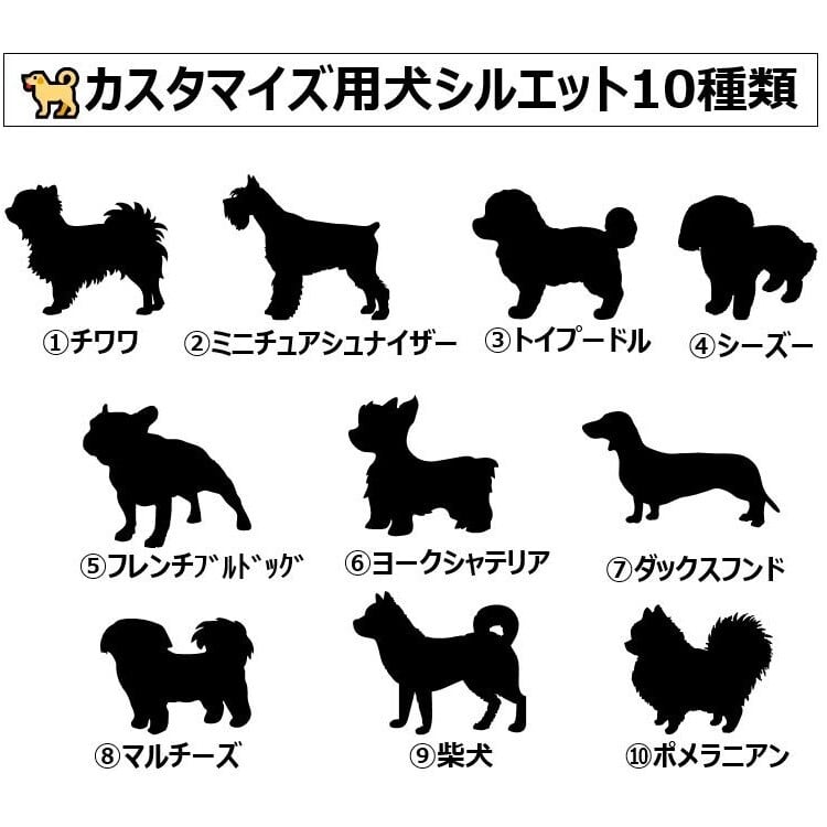 ★掲載写真ページにあります『カスタマイズ用犬10種類』からお好きな犬のシルエットを選んで商品トップページの『種類』から選んで購入してください。